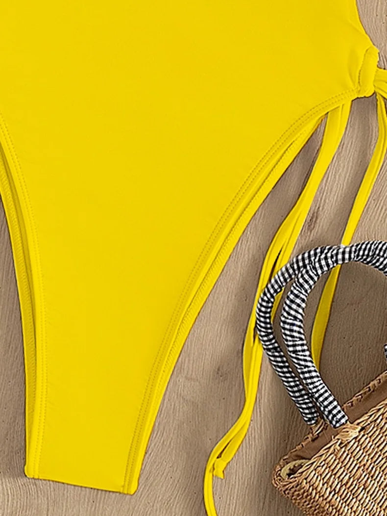 Fashion Solid Deep V Neck One Piece Swimsuit Women Yellow White Hollow Out Pleate Swimwear Beach Bandage Bathing Suit Monokini